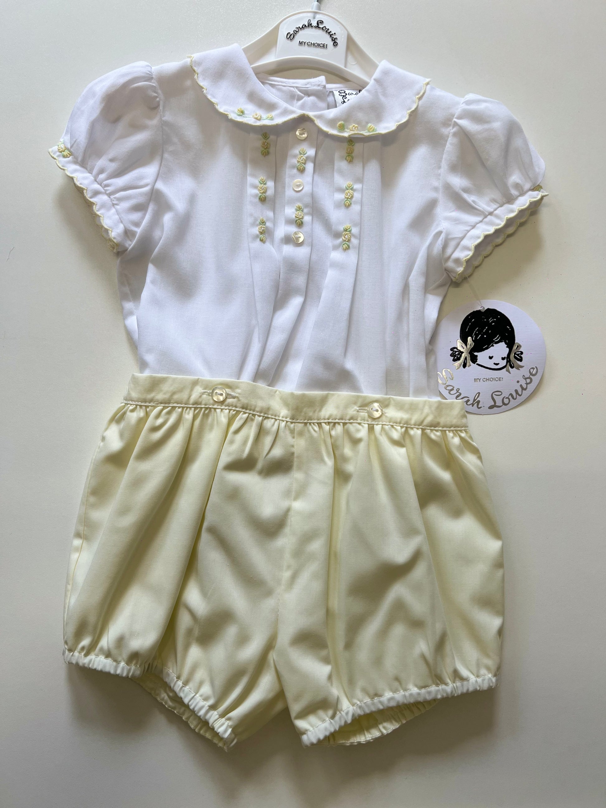 Baby girls two piece set, includes a white blouse with lemon embroidered flowers, to the front, collar and sleeves. Fastens together with buttons to front and back.