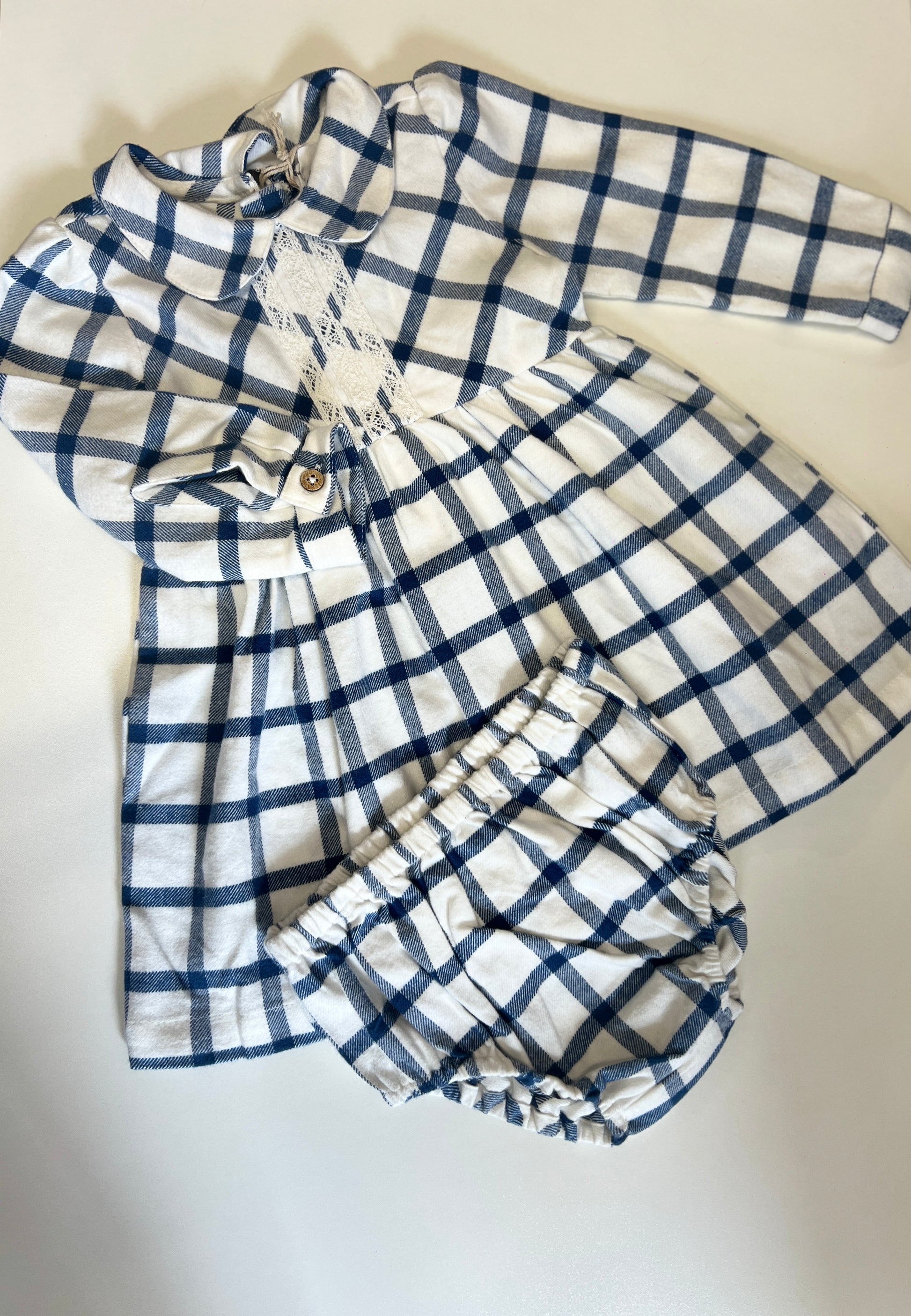 Kite long sleeve dress and pants set, in a white and blue check design, with lace decoration on the front, pants to match in the same design, made from organic cotton