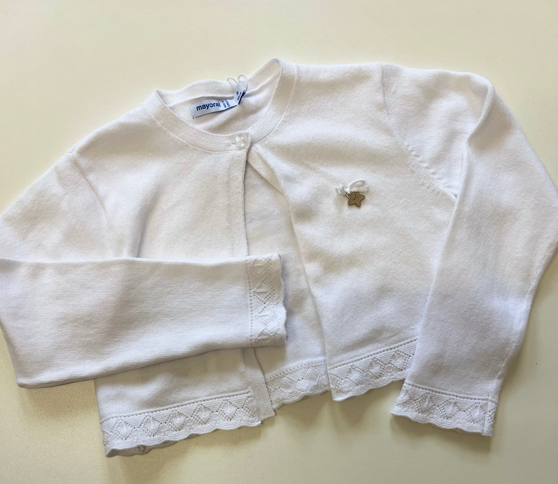White long sleeve cardigan, with pattern around the cuff and on the hem, also with a star detail.