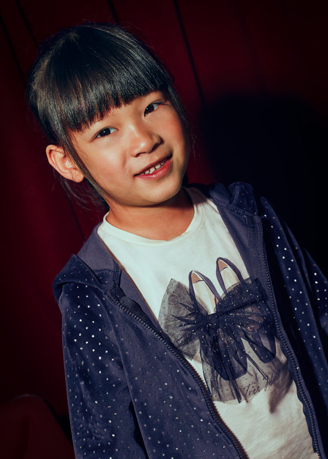 Mayoral 3 piece tracksuit, consists of long sleeve t shirt with a shoe design and a bow on the front, the top has a hood and zip fastening with silver sparkly dots all over, finally the tracksuit bottoms are also in velour with an elasticated waist and 2 pockets