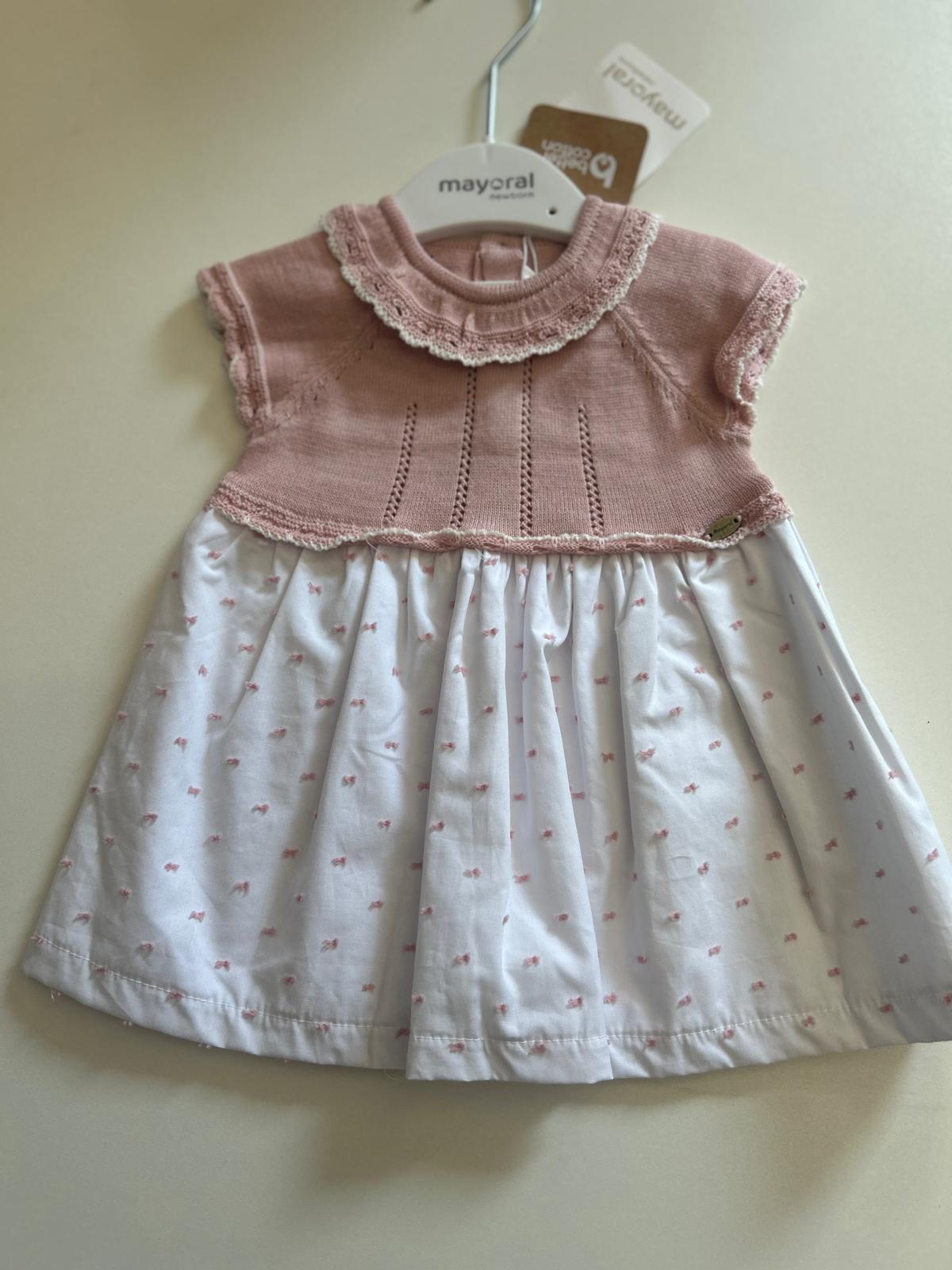 Mayoral baby girls dress, with a knitted top half and cotton bottom half. with button fastening to the back.