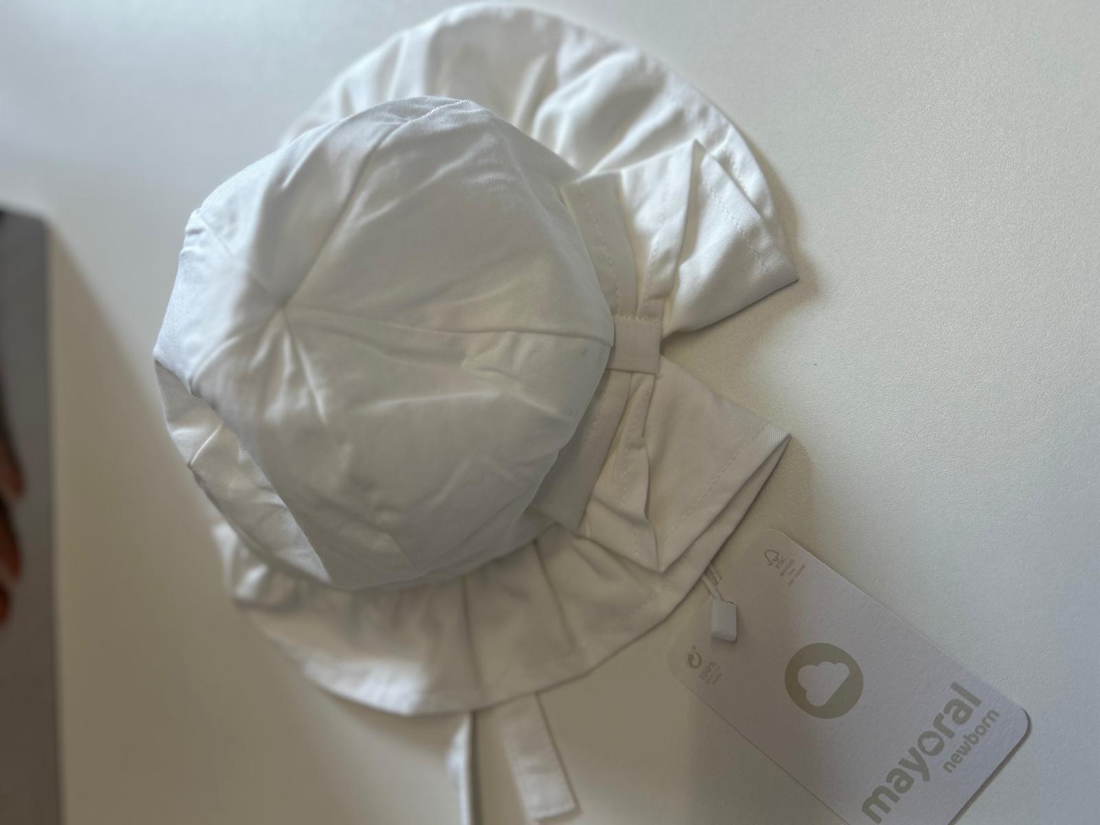 Mayoral baby girls hat, has a tie fastening and a bow to the back