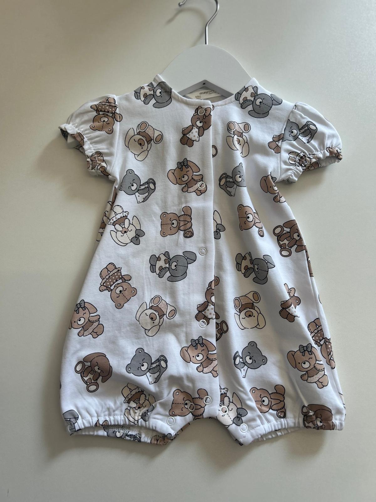 Mayoral baby girls short sleeve romper, with press studs down the front, in a teddy bear print