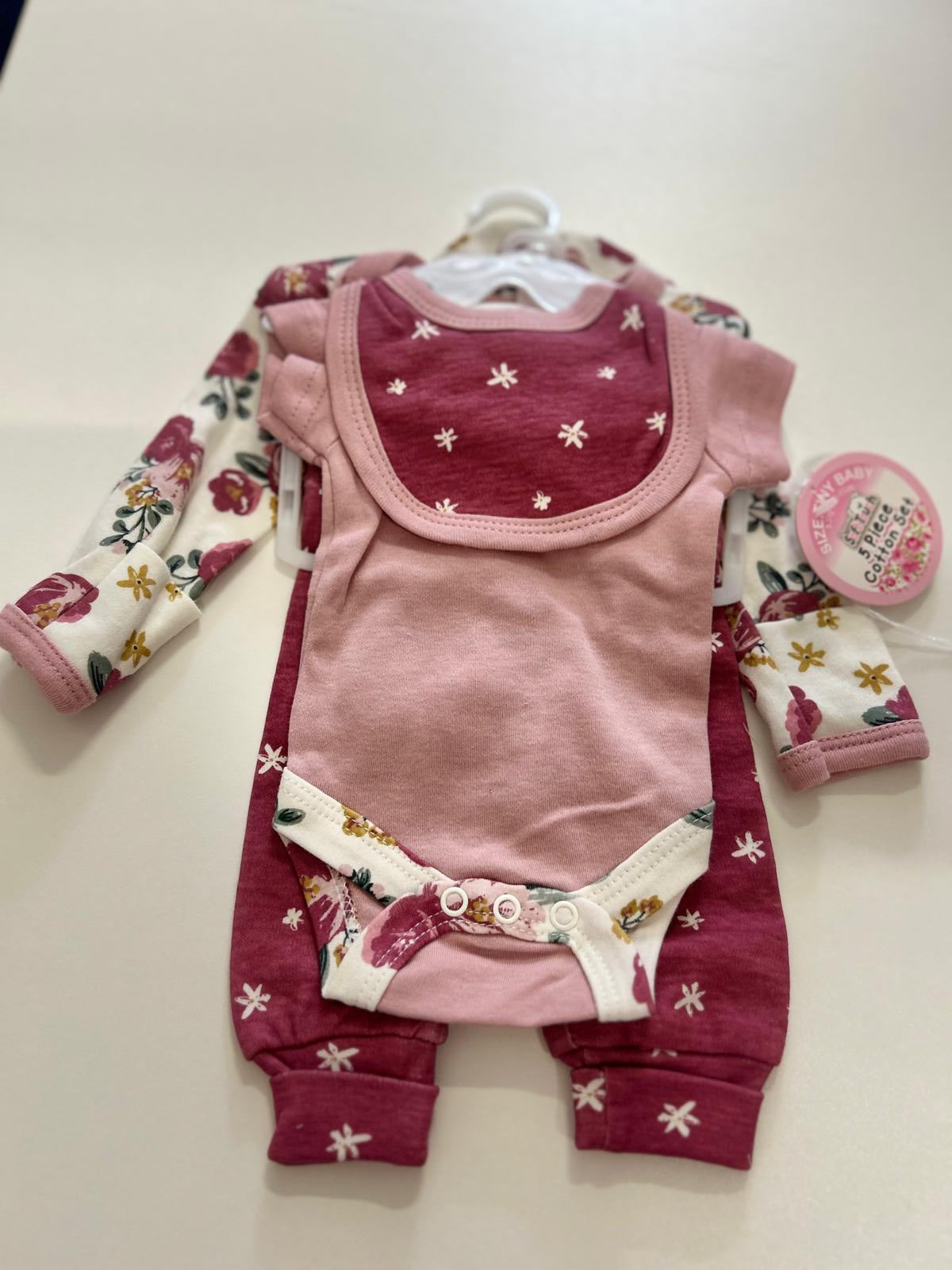Premature baby girls 5 piece set, includes hat, bib, bodysuit, pants, cardigan. In a pink/flower design