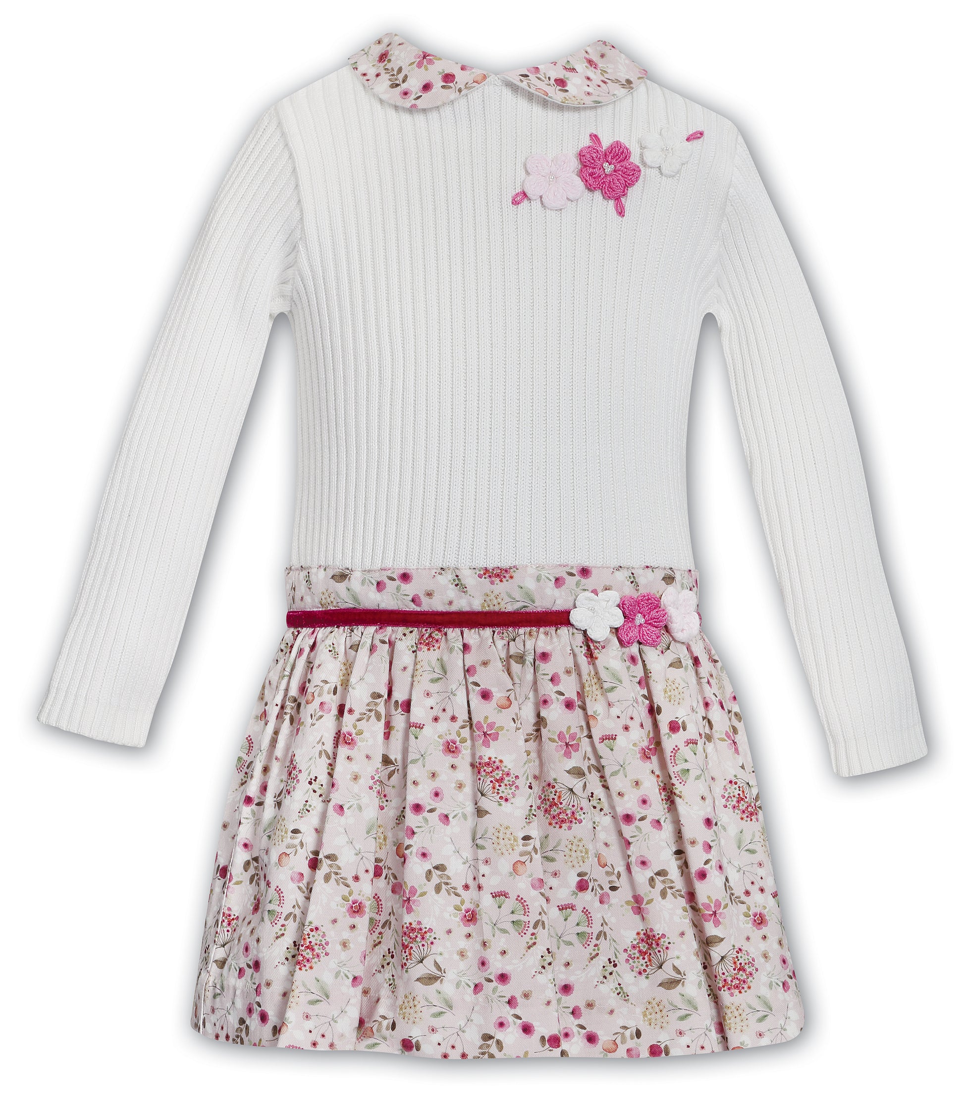 Sarah Louise dress, with a knit rib top and a flower skirt, has a contrasting collar, and flower detail