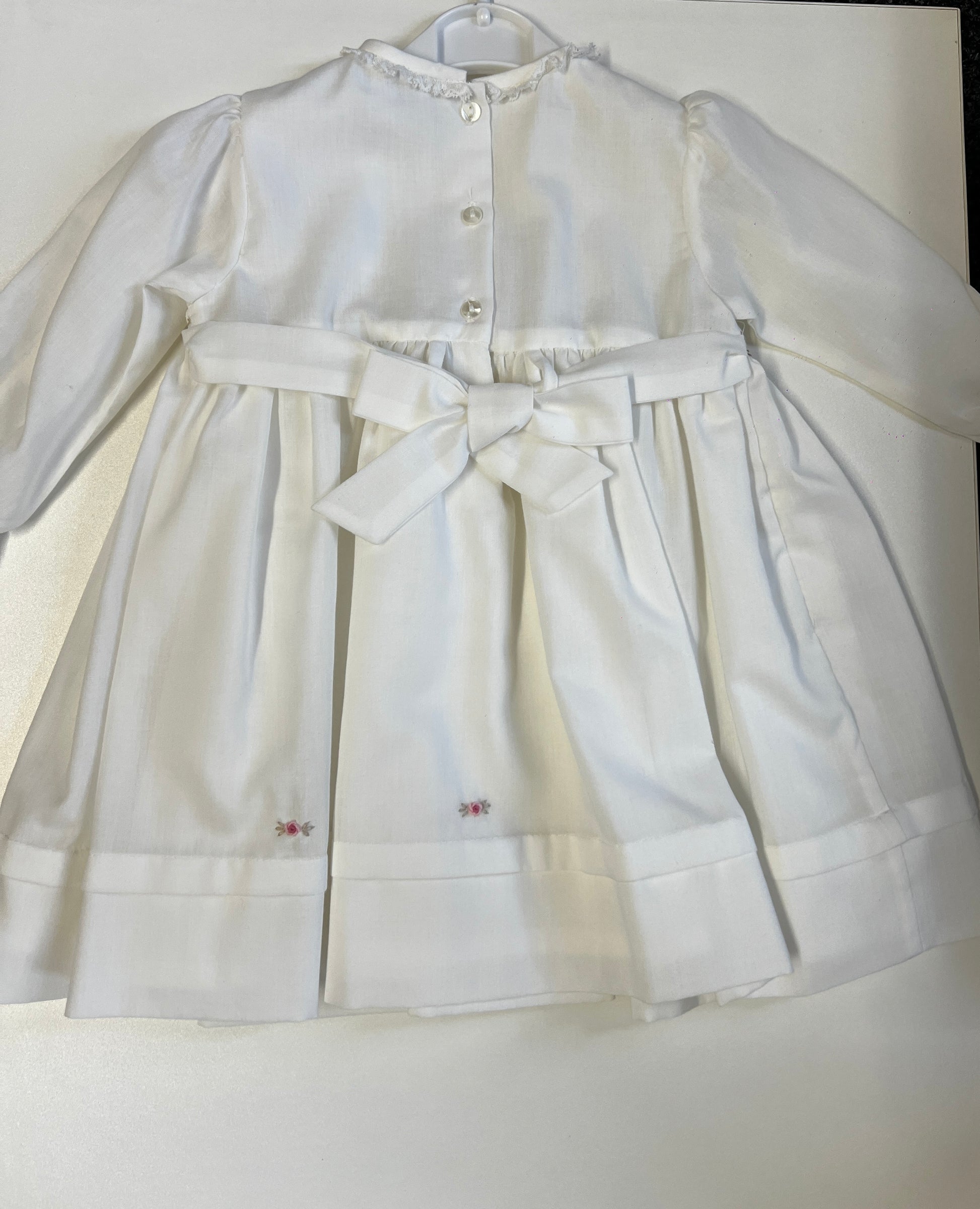 Sarah Louise Ivory long sleeve dress with hand smocking too the front and gold trim with pink flower detail, the dress has a tie bow at the back