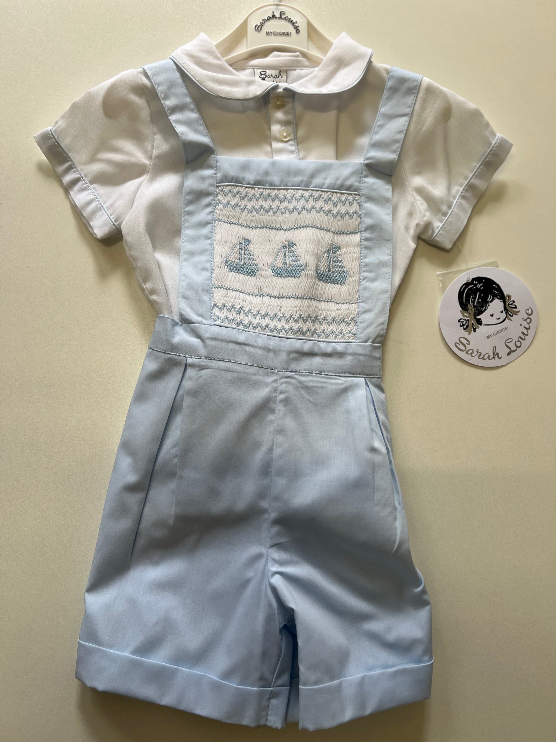 Two piece set with short dungarees, with hand smocked boats to the front.